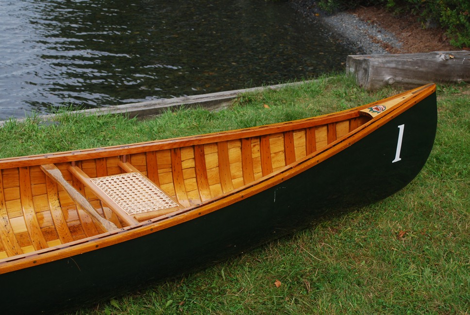 This is a new custom made closed gunwale canoe that we built. The trim is all mahogany trim and the paint is a two tone white and green. This is the construction that was commonly used pre 1910.